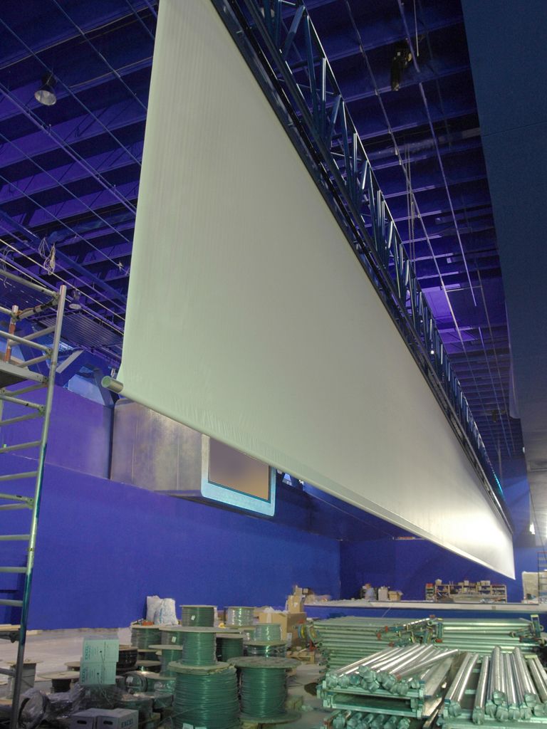 Modularni in motorizirani projekcijski zaslon, za sprednjo ali zadnjo projekcijo, velikih dimenzij. Dobavljiv v dolžini od 8 do 50 m.